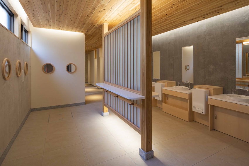 Vue intérieure des toilettes Miyajima Omotenashi : Des proportions généreuses, des lavabos et des miroirs clairement alignés ainsi qu’un éclairage bien pensé facilitent l’orientation, le confort et une utilisation intuitive.