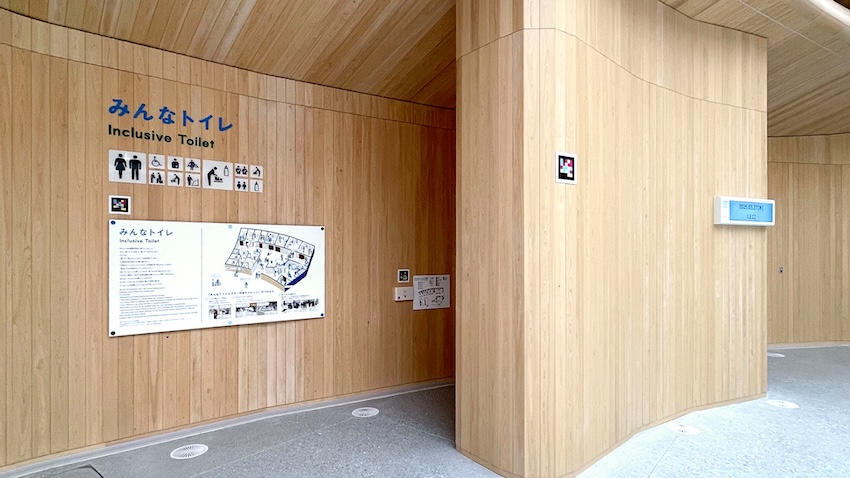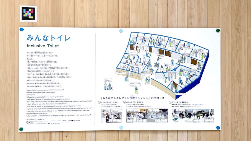 Panneau indicateur sur les toilettes inclusives dans le pavillon de la santé d’Osaka : ce panneau explique l’aménagement et l’utilisation des installations sanitaires accessibles aux personnes à mobilité réduite et rend les principes de la conception universelle compréhensibles pour tous.